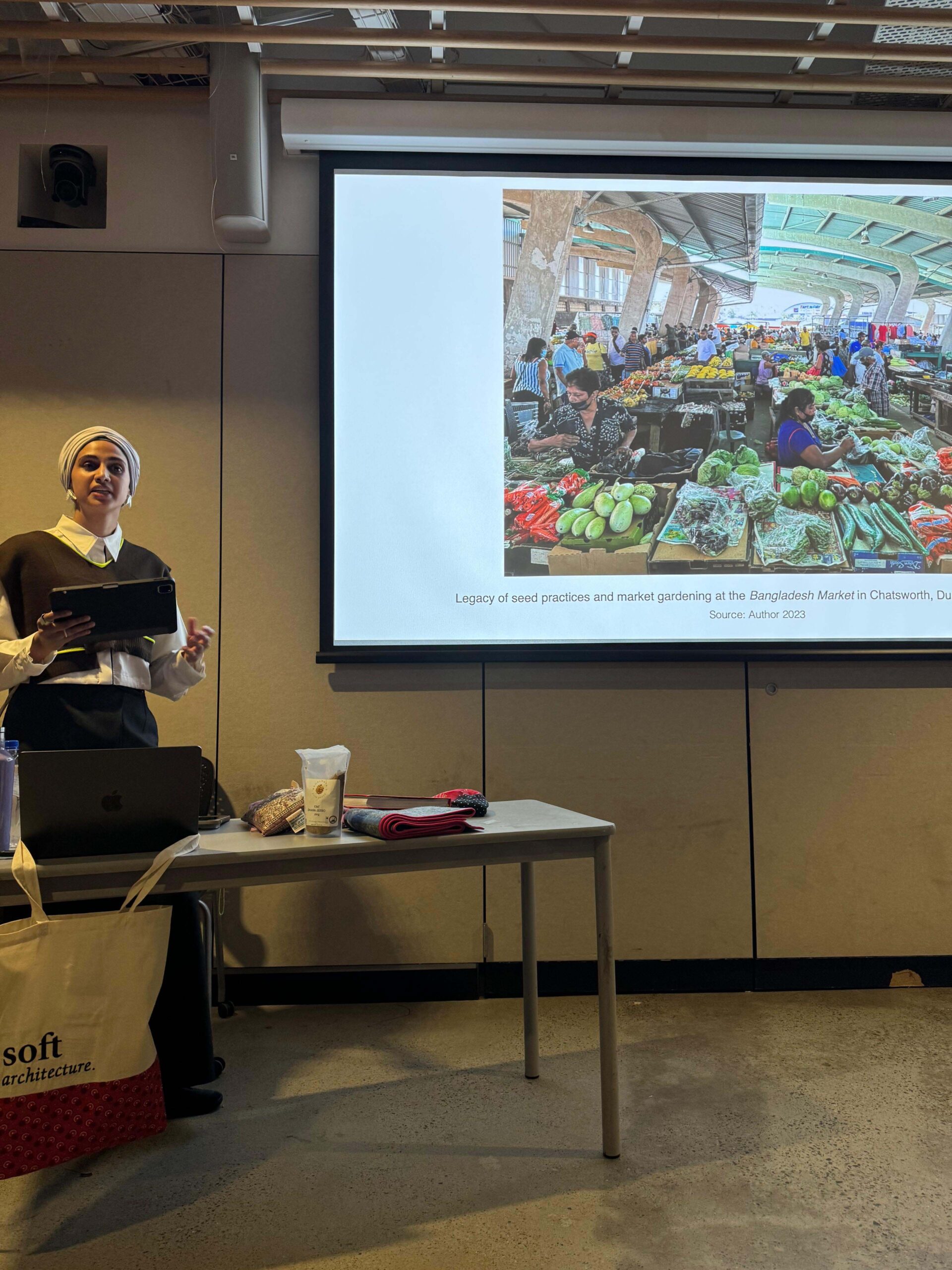 Amid ongoing violence, displacement, and cultural instability, there is an urgent need to rethink architecture as a tool for destruction and erasure. This work advocates for a transformative shift by drawing on the material and spatial practices of migrants. Migrants often create soft architectures—temporary, inter-scalar spaces—that resist restrictive systems and offer opportunities for reclamation and agency within exclusionary environments. Soft architecture is embodied in the objects and knowledge migrants carry with them as they build their homes. These practices engage with micro-transactions and community organisations, fostering spaces where cultural and social production thrive. Within the South African Indian diaspora, these practices are tangible through the tactility of plants, food, and textiles.